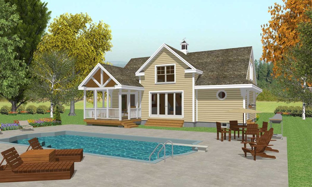 Nautical-style windows and wrapping roof overhangs make this craftsman-style home perfect for a waterfront or poolside home. The easily expandable upper level can add more living space.