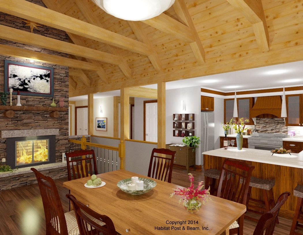 This one level plan of under 1700 has 3 bedrooms and 2 baths, all within a simple foot print. The dining room is adjacent to the living room and share a timber framed ceiling. Most designs can be adapted to add or remove walkout basements, garages, porches, etc., as desired (framing materials by owner/contractor). The 1417 walkout level (daylight basement) is not included in the pricing.