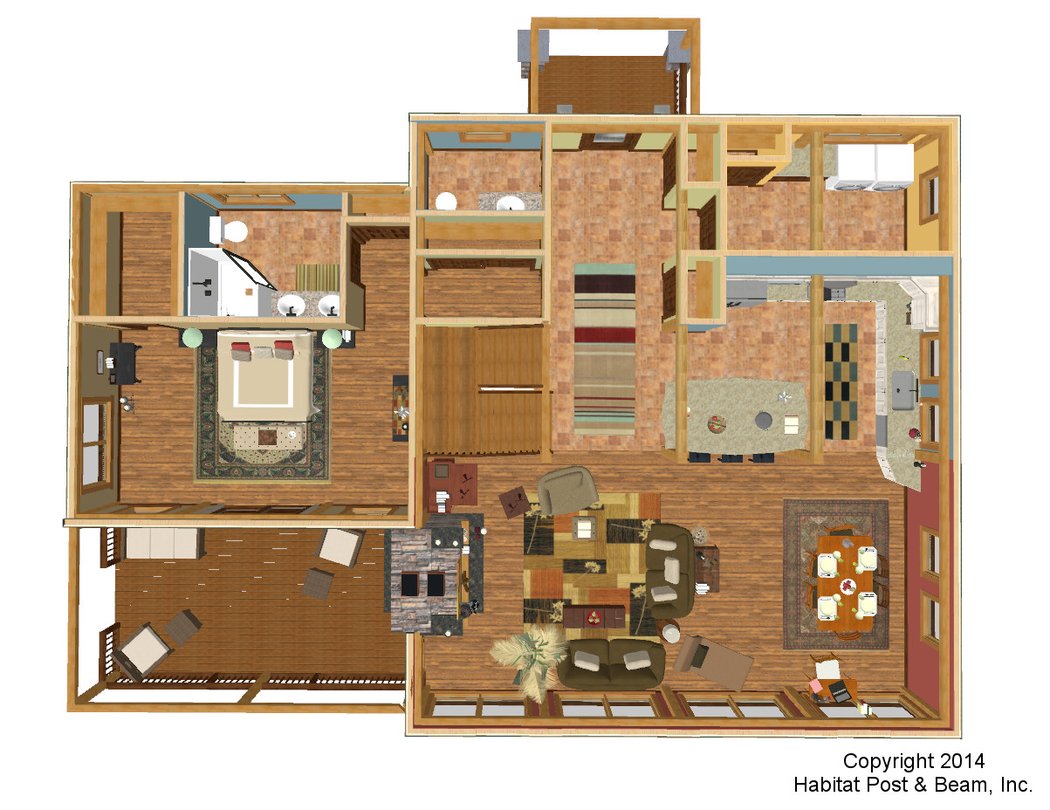 This home is a take-off of our Bosque Prow design, but was made to feel more like a Craftsman Lodge. It has an open kitchen, dining and living room and first floor master suite. The upper level has a 2nd bedroom suite and loft. Most designs can be adapted to add or remove walkout basements, garages, porches, etc., as desired (framing materials by owner/contractor). The 1552 walkout level garage is not included in the pricing.