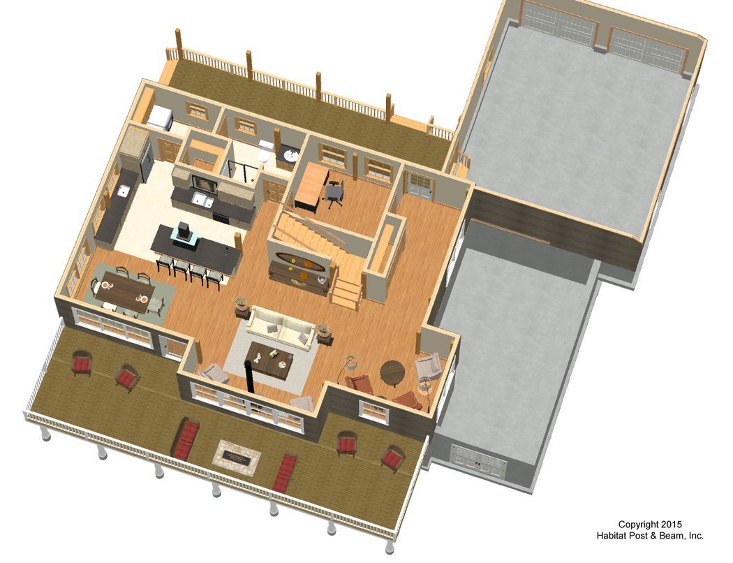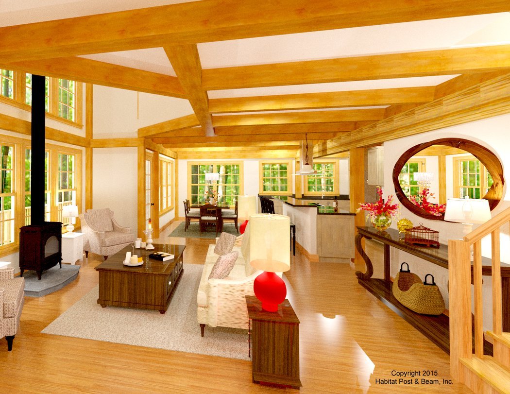 This custom home with a walkout level (not included) has a colonial/farmhouse feel, with traditional aesthetics. The main level is about 1200 sq. ft. and includes a central living area with a woodstove, as well as the dining room and a reading nook on the back side. To the front of the main level is the kitchen, a study (which could be used as a main level bedroom), entry, and full bath with laundry room. The flat ceiling area of the main level uses our Plaster and Accent Beam Mid-Floor system, and the walls are our Full Exposure Framing system. Upstairs is about 1100 sq. ft. and includes the master bedroom suite on one side, and two bedrooms and a bath to the front of the house. There is a loft sitting area to the back of the house that looks down onto the living area below. The upper level has our Beamed Roof System throughout. The 1092 walkout level basement (not included) includes two additional bedrooms, a bathroom, a game room, and utility/storage areas. (The attached two-car garage is designed by us, but not included in the Habitat package).