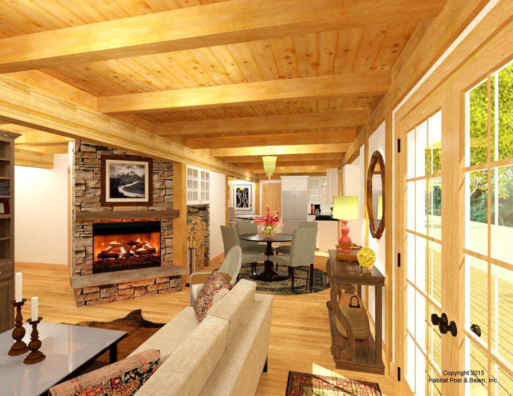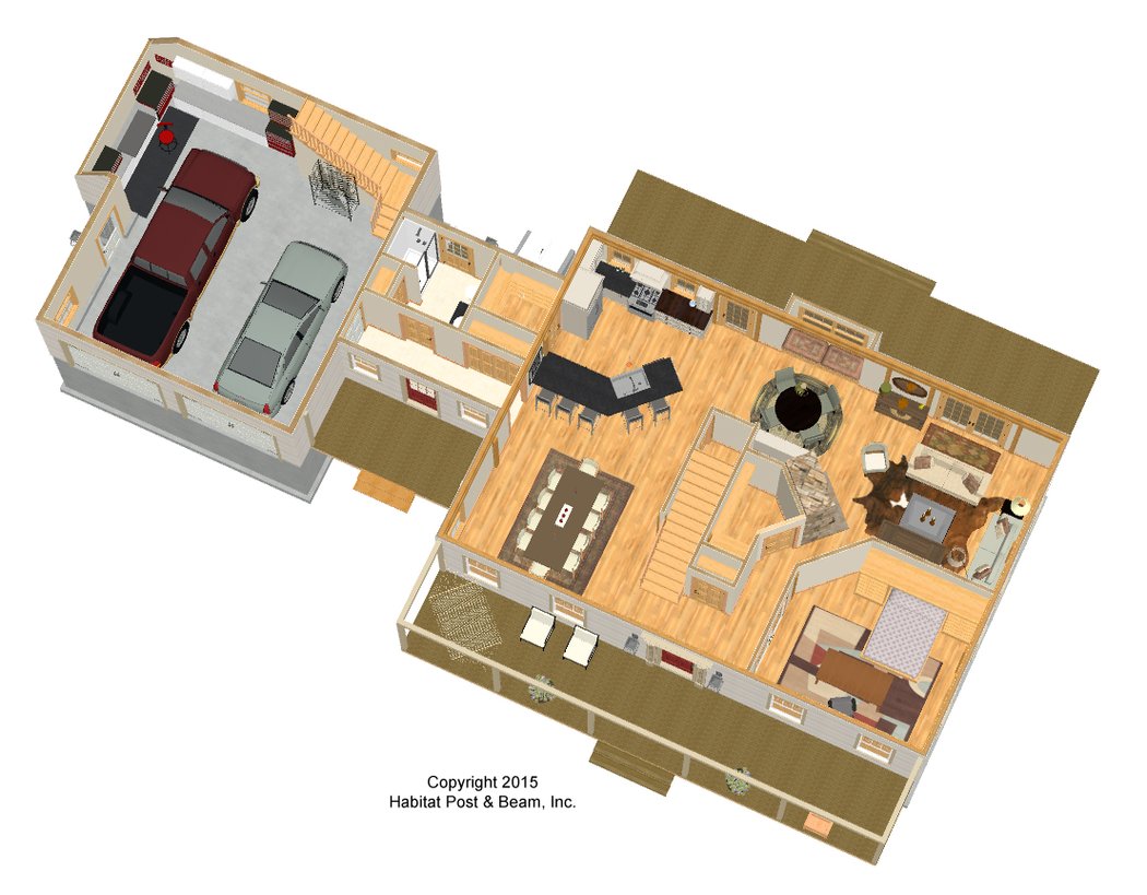 This latest design is a custom cape-style house with an attached two-car garage (garage is by others). The main level of about 1500 has a central stairway that creates a circular floor plan. Toward the front of the house is the entry, dining room, and a private den that could be used as a main level bedroom. Toward the back of the house is the kitchen, breakfast space, and living area with a fireplace. A connector with a bathroom and pantry links the house to the garage. The main level features our standard Beamed Exterior Wall System, and 6×8 Douglas fir joists with wood or Sheetrock ceiling liner for a flat ceiling throughout. Upstairs is about 1200 and has a master bedroom suite on the left side of the upper level, a bathroom in the center rear, and a laundry room at the center front. Two additional bedrooms are on the right side. The upper level uses our Plaster and Beam Roof Framing System, and the dormered front rooms have a cathedral ceiling. The garage is not included in the above pricing.