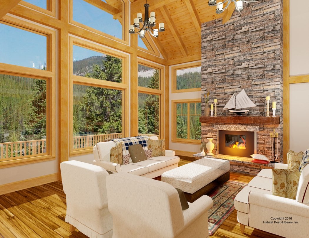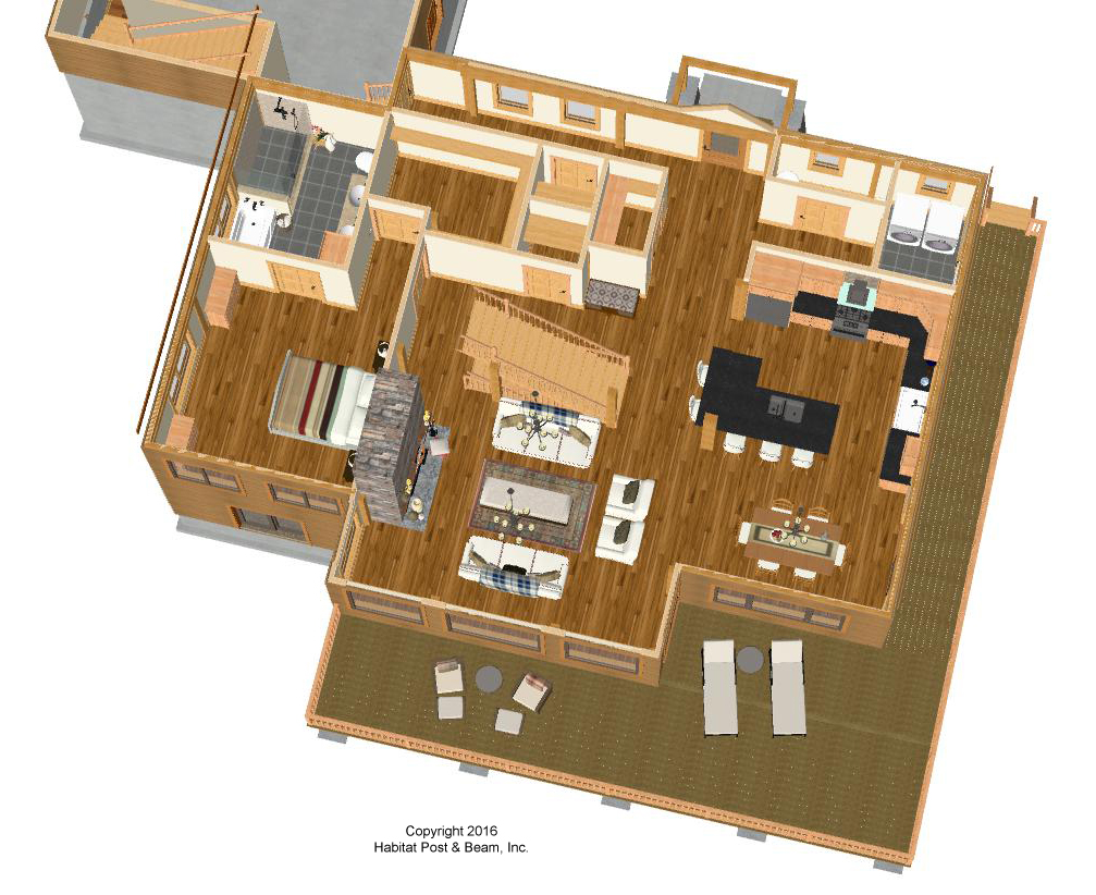 This custom five-bedroom home with garage/guest house (garage is by others) will be built in northern Vermont. The main level of about 1600 sq. ft. has a center section with a beamed cathedral ceiling in the great room, and an entry/spacious hall in the back; a center stairway is between. One side of the main level houses a master bedroom suite, and the other the kitchen/dining and laundry area with half-bath. Upstairs (about 1200) has three more bedrooms with cathedral ceilings, an additional full bathroom, and a loft and office area. The upstairs hallway area is open and looks down onto the living space below. A 1420 walkout basement level (not included) is designed for a game room, utilities, and an additional bedroom and a full bath. The attached two-car garage (not included by Habitat) doubles as a guest suite with a fully equipped living/kitchen/laundry area on the second floor, and a bedroom and bath. Note – computer renderings are from the first design created, actual structure was built according to final plan design, and may differ from these initial sketches.