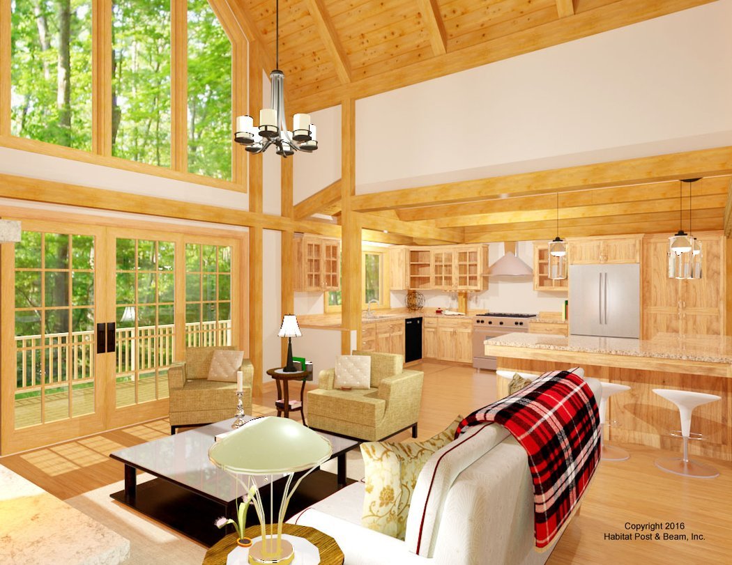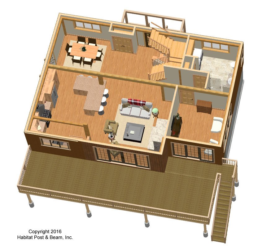 Based on our Lodge series, this custom home will be built in the Five College Region of western Massachusetts. The main level is about 1212 sq. ft. with a beamed cathedral ceiling over the rear center section living room. The front of the center section (hallway/foyer) and both sides of the main level have a Plaster and Beam Mid-Floor System above. The right side is for the kitchen and dining room, and the left for a den/library and large full bath with laundry. Upstairs is about 870 sq. ft., and each wing has a bedroom and full bath connected by a central stair landing and a loft that looks down onto the living area below. The entire upper level uses our Plaster and Accent Beam cathedral ceiling. The basement walkout level (not included) of about 1212 sq. ft. is currently designed for utility/storage space.