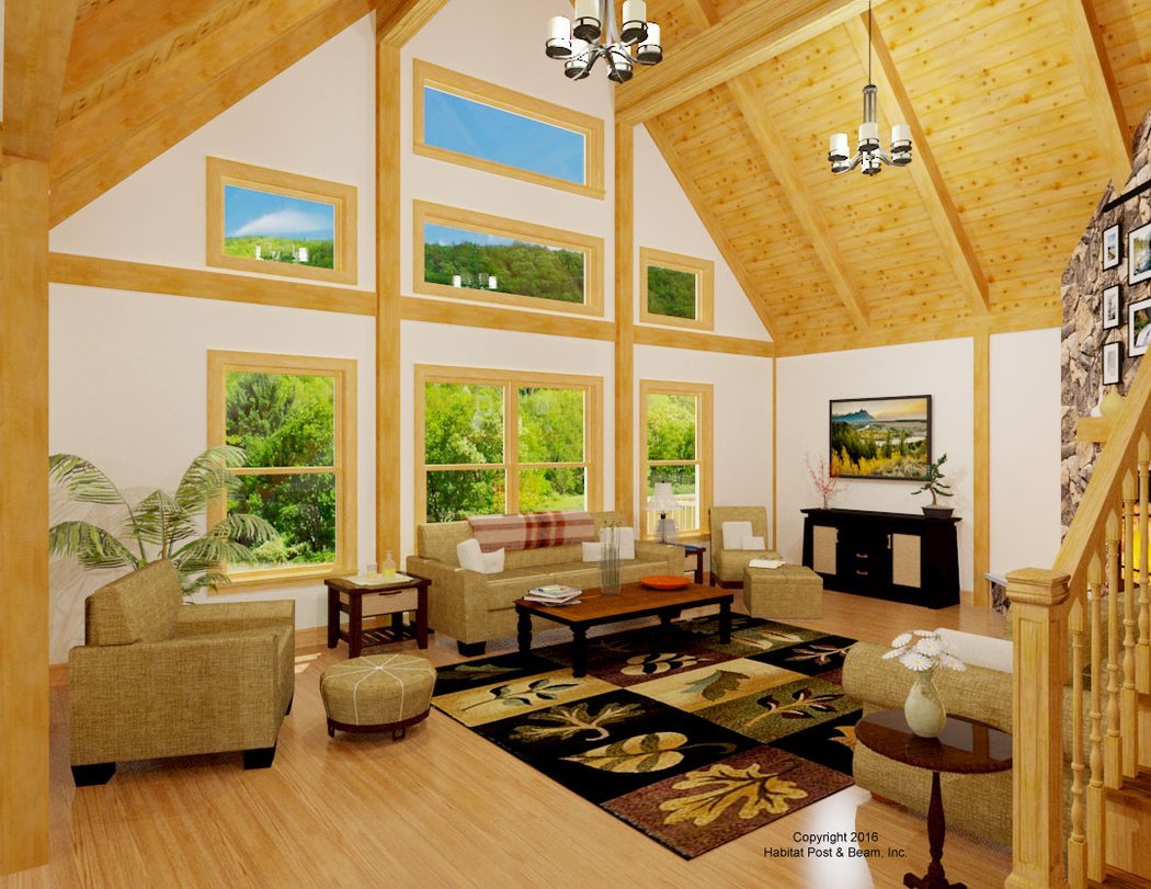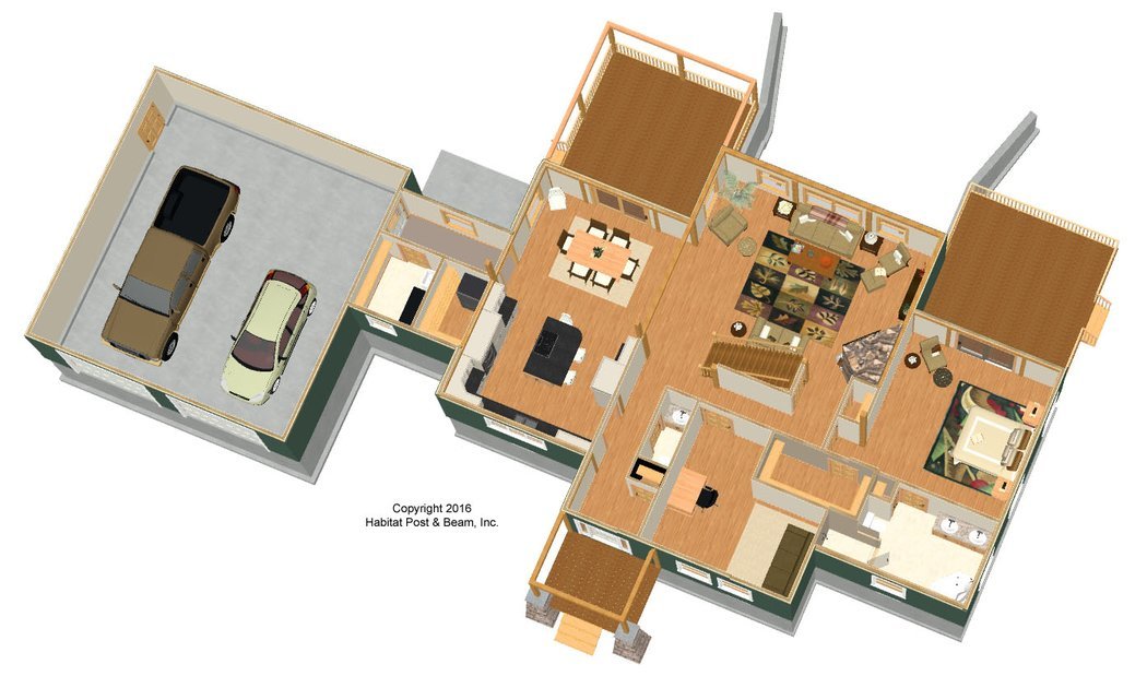 This custom home based on our Lodge series will be built on a country road sited between a town forest and a pond. The main level is about 2000, and the center section is the living room with a beamed cathedral ceiling, hallway, half-bath and study. The right wing is the large kitchen and dining area, and the left wing is a master bedroom suite. Both single-level wings and the upper level have our Plaster and Accent Beam Roof System. Upstairs there are two additional bedrooms of about 250 with cathedral ceilings, and a loft that looks down onto the living area below. The 1792 lower level walkout basement is designed as a family room in the center (which opens out to the backyard beyond), surrounded by storage and utility space. The garage, 160 connector, and walkout basement are not included in the above pricing.