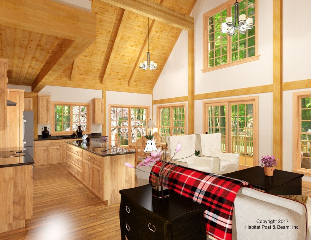 Here is a rustic cape with our Full Exposure Wall Framing System and Beamed Roof System throughout, to be built in southwestern Connecticut. At about 1290 sq. ft., all main-level living is possible as the master bedroom suite is on the first floor left side. Areas with a flat ceiling above use the Beamed Mid-Floor System. To the right side of the main level is the kitchen, living and dining area with a beamed cathedral ceiling, and the center section houses a half-bath, closet, laundry, and hallway. Upstairs are two additional bedrooms, a bath, and a loft that looks down onto the living area below. The entire 705 sq. ft. upper level has a beamed cathedral ceiling. Note – these renderings are just the first ideas for our client’s project. The actual home that is built is a result of subsequent plan modifications, and may differ from these original plans. The walkout level (daylight basement), garage, and connector are not included in the above pricing.