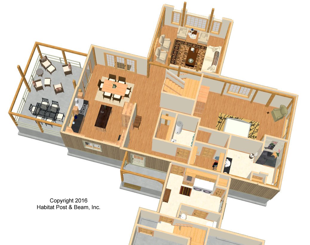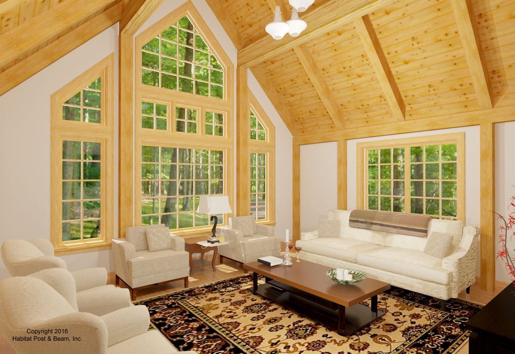 This pretty, multi-gabled home will be built adjacent to the Adirondack Forest Preserve in upstate New York. The main level is about 1800, with the center section used for entry/hallway and storage. To the center-rear is the living room with a Beamed cathedral ceiling. The left side is the kitchen with a Beamed Mid-Floor/ceiling system above and the dining area with a Beamed cathedral ceiling. The dining room opens out to a screen porch with a cathedral, wood-lined ceiling. To the right side is a spacious master bedroom suite with a Plaster and Beam Mid-Floor/ceiling above. A 213 sq. ft. mud room/laundry and half-bath connector leads to the two-car garage with storage space above (not included). Upstairs there are two additional bedrooms with a cathedral Plaster and Accent Beam Roof System above, a full bath, and a loft sitting area that looks down onto the dining area below. The entire home features our Full Exposure Wall System throughout, and sits on a slab foundation. The garage and connector are not included in the above pricing.