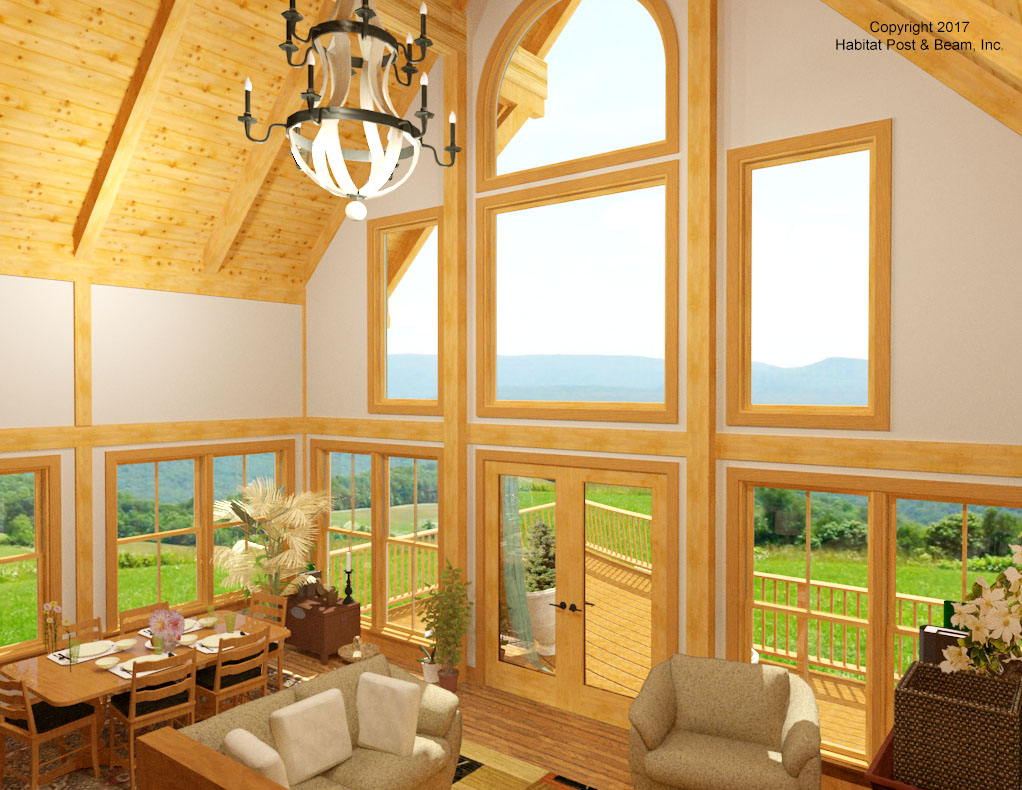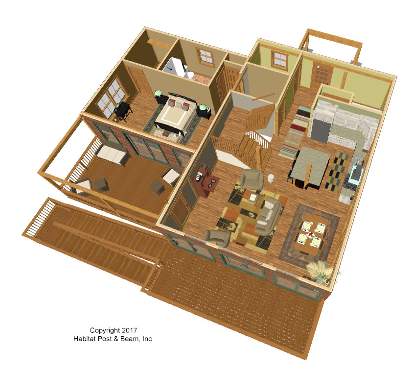 This is a perfect little empty-nesters’ home, at about 1300 for the main level. It will be built in the countryside of Hampshire County in western Massachusetts. The main house entry and mud room area includes a half-bath, and this area leads into the central stairway and kitchen. The entry and kitchen areas are both under our Beamed Mid-floor System. Toward the back of the main level is the great room and dining area under a beamed cathedral ceiling. The master bedroom ell with a beamed cathedral ceiling is off to the side, and opens out onto a shared screen porch. Upstairs is about 500, and is currently drawn to accommodate another full bath. The loft is a lounge/sitting area that looks down onto the living area below. A drive-under garage fills much of the basement level, with additional rooms laid out for storage and utilities. The 1080 walkout level garage is not included in the pricing.