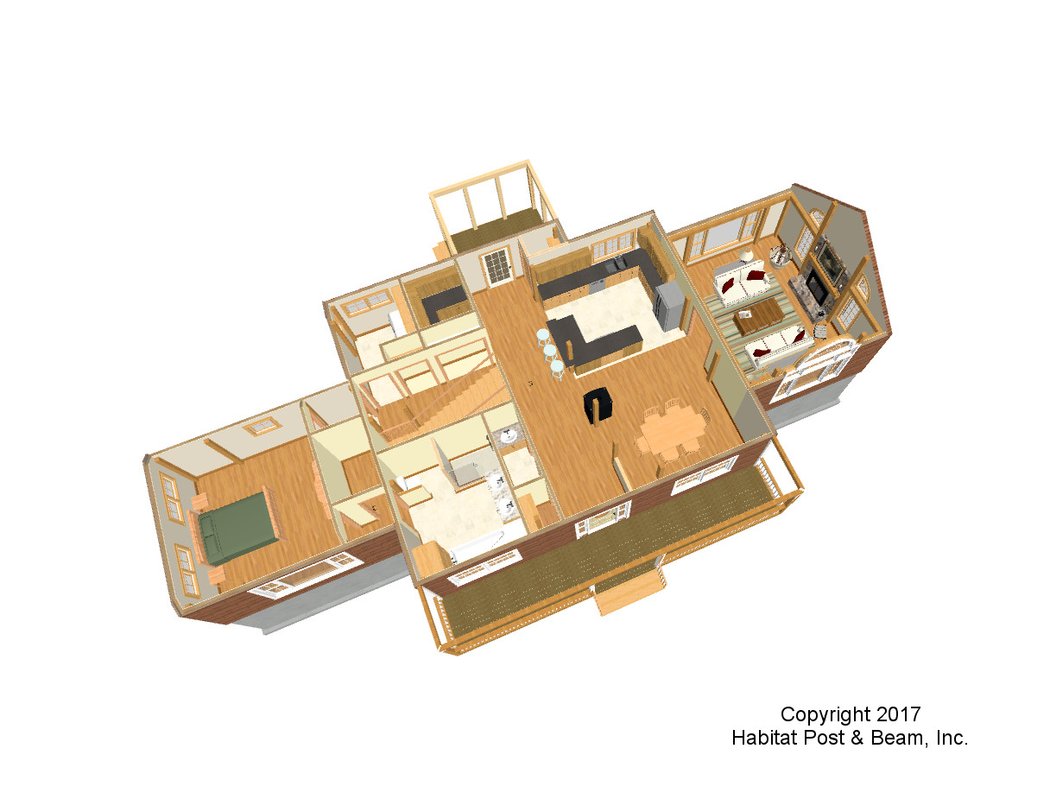 This is a contemporary Cape-style home that takes advantage of a sloping lot to accommodate a one-car, drive-under garage. The main level is about 1700, and the center section housing the kitchen, dining, laundry, pantry, half-bath and master bath are all under a beamed flat ceiling. The left side ell is the master bedroom suite, and the right side ell is the living area with a fireplace. Both ells are under a beamed cathedral ceiling. To the back side is a small three-season porch under a cathedral ceiling. The entire lower level has a Full Exposure Wall Framing System. The upstairs 1100 sq. ft. are for two additional bedrooms, a full bath, a multi-use room currently designed as an office, and an entertainment nook tucked into the front central dormer. The entire upstairs is under a conventionally framed ceiling. The 1570 garage level is not included.