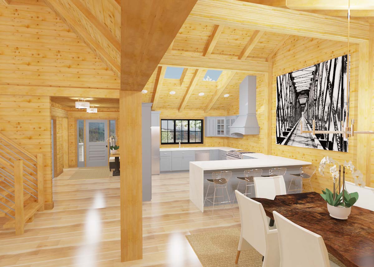 Another from our popular Lodge series, this custom home based on the Birch Hill using our Full Exposure Exterior Wall System throughout will be built in a lakes neighborhood in northwestern Michigan. The main level is about 1800 sq. ft. with the front center section under a flat ceiling/Beamed Mid-Floor System. To the center rear is the living room under a cathedral Beamed Roof System. The kitchen and dining wing is to the left (with a large screen porch adjacent), and the master bedroom wing is to the right; both wings are under a cathedral Beamed Roof System. Upstairs is about 500 sq. ft. with two additional bedrooms and a shared full-bath, and a loft sitting area that looks down onto the living area below; the entire upper level is under a cathedral Beamed Roof System.