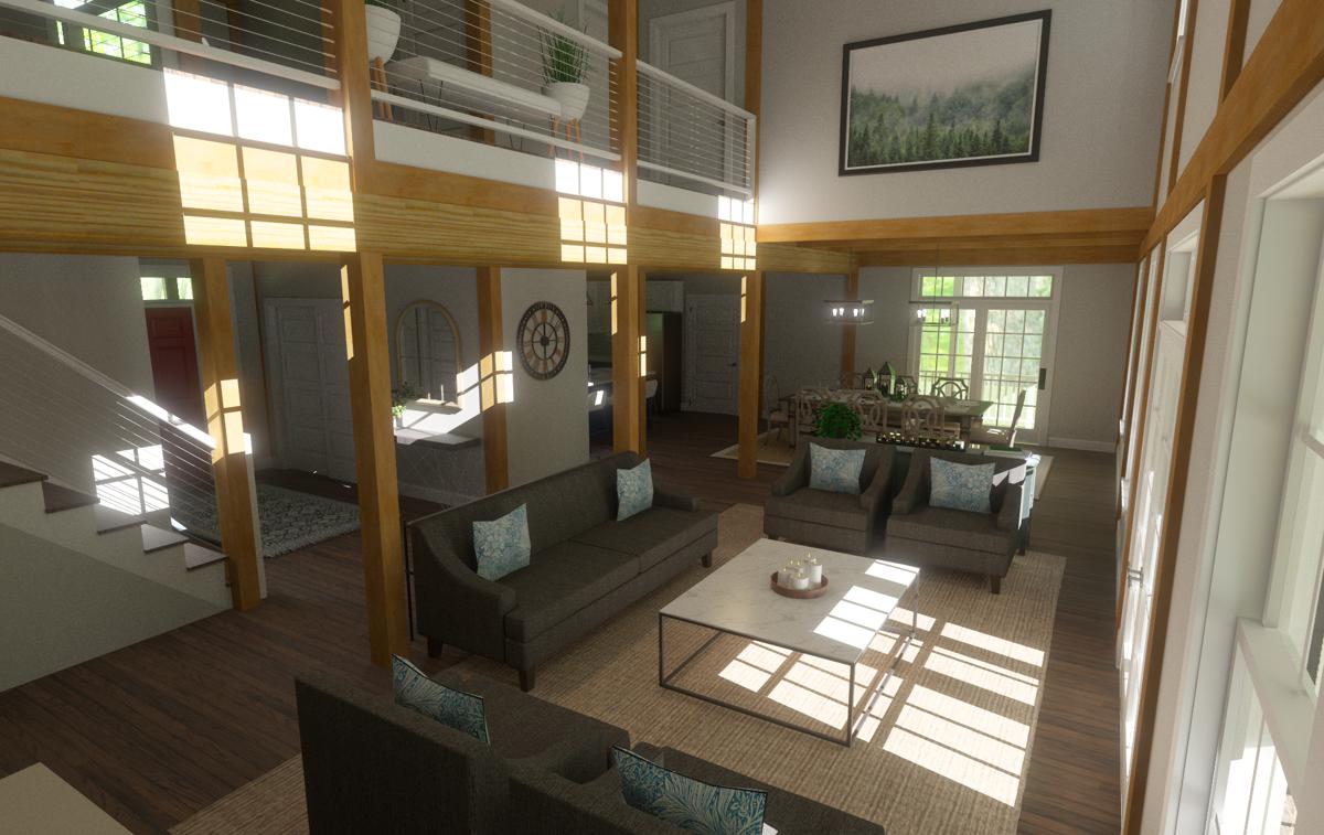This traditional, center-hall Colonial with our standard Beamed Exterior Wall System throughout is designed to be built in nearby Hampshire County. The main level is about 1600 sq. ft. with the kitchen and dining room to the left, the primary bedroom suite on the right, and the entry hall is front and center; these areas are all under a flat ceiling/Plaster and Beam Mid-Floor System (mudroom bumpout off of kitchen is conventionally framed by owner/contractor). To the rear is the centered great room under a cathedral Plaster and Accent Beam Roof System. Upstairs is about 1125 sq. ft. with two bedrooms on one side (flat ceilings), and a bedroom and full bath (flat ceilings) on the other, flanking the cathedral central loft that looks down onto the living area below. The full basement is currently designed for storage and utilities.