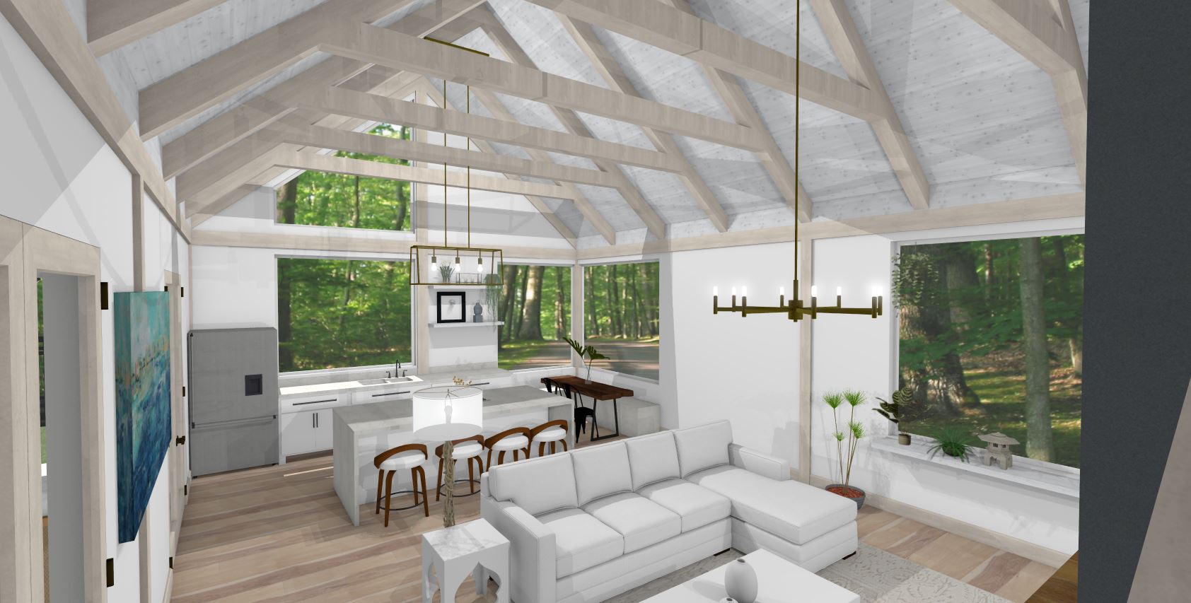 The lower package price assumes more drywall finishes, while the upper price assumes more exposed timbers and wood ceiling finishes. Select the wall system, mid-floor system, and roof system(s) you would like for your project based on aesthetics, budget, and practicality. Our package price can be reduced by removing any of the exterior finish materials that we typically supply (siding/ trim, roof shingles, windows/doors). Note that when shipping outside the northeast almost all packages have those items removed, as shipping them long distances doesn't usually make sense.